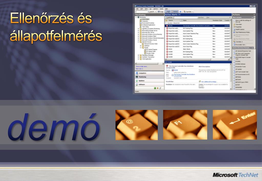 Menedzsment csomagok* Termékspecifikus készletek Események, riasztások, konfigurációs problémák Teljesítménymérés, állapotfelmérés Kliens platformok és alkalmazások Windows 2000, XP and Vista Client platform Office XP, Office 2003, Office 2007 Windows Explorer, IE, Media Player, Outlook Express, Windows Messenger Kiszolgáló alkalmazások Microsoft SharePoint Portal Server 2003, Microsoft SQL Server 2000 and 2005 Microsoft Dynamic CRM 3.0, Windows Server Update Services 3 Microsoft Exchange Server 2003 Kiszolgáló platform Windows 2000 and 2003 Server platform, Active Directory Internet Information Services, Terminal Services, Windows SharePoint Services 2003 * http://www.microsoft.com/technet/prodtechnol/mom/catalog