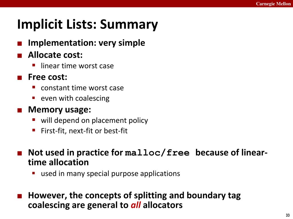 Implicit Lists: Summary • Implementation: very simple • Allocate cost: • linear time worst case • Free cost: • constant time worst case • even with coalescing • Memory usage: • will depend on placement policy • First-fit, next-fit or best-fit • Not used in practice for malloc/free because of linear-time allocation • used in many special purpose applications • However, the concepts of splitting and boundary tag coalescing are general to all allocators