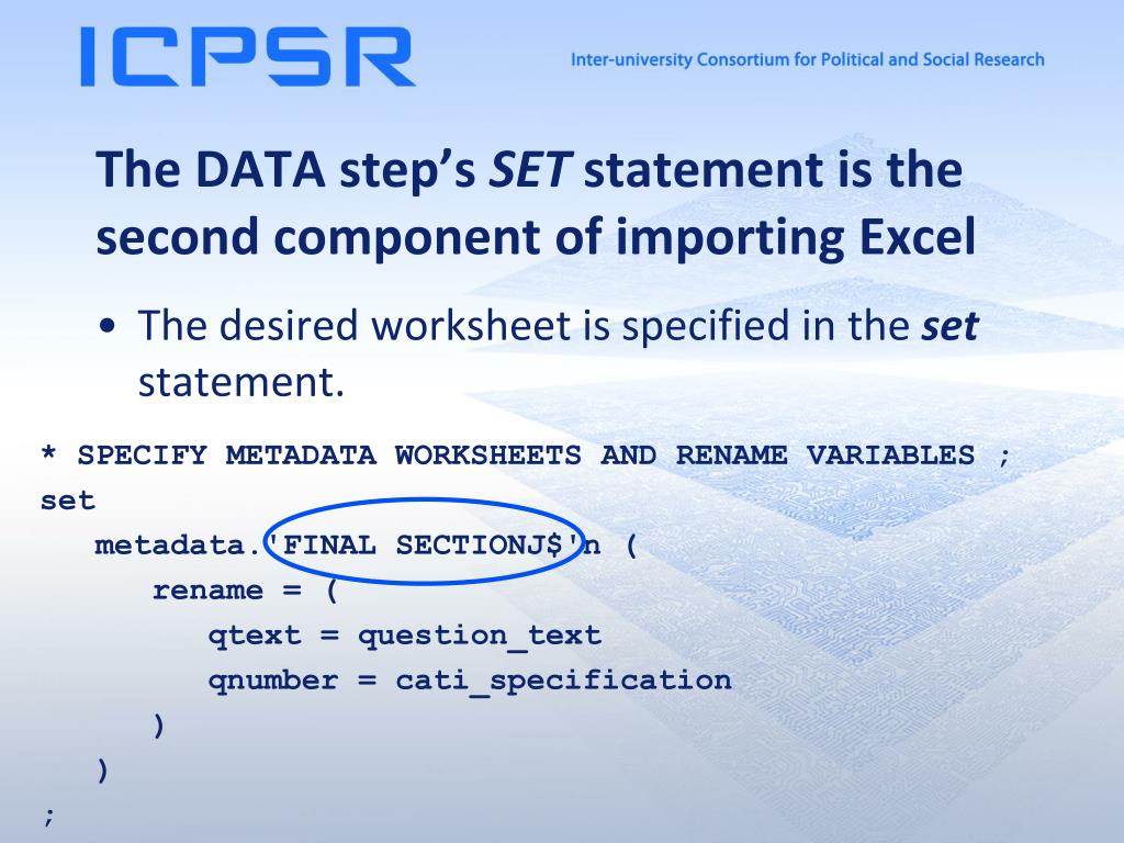 The DATA step’s SET statement is the second component of importing Excel • The desired worksheet is specified in the set statement. * SPECIFY METADATA WORKSHEETS AND RENAME VARIABLES ; set metadata.'FINALSECTIONJ$'n ( rename = ( qtext = question_text qnumber = cati_specification ) ) ;