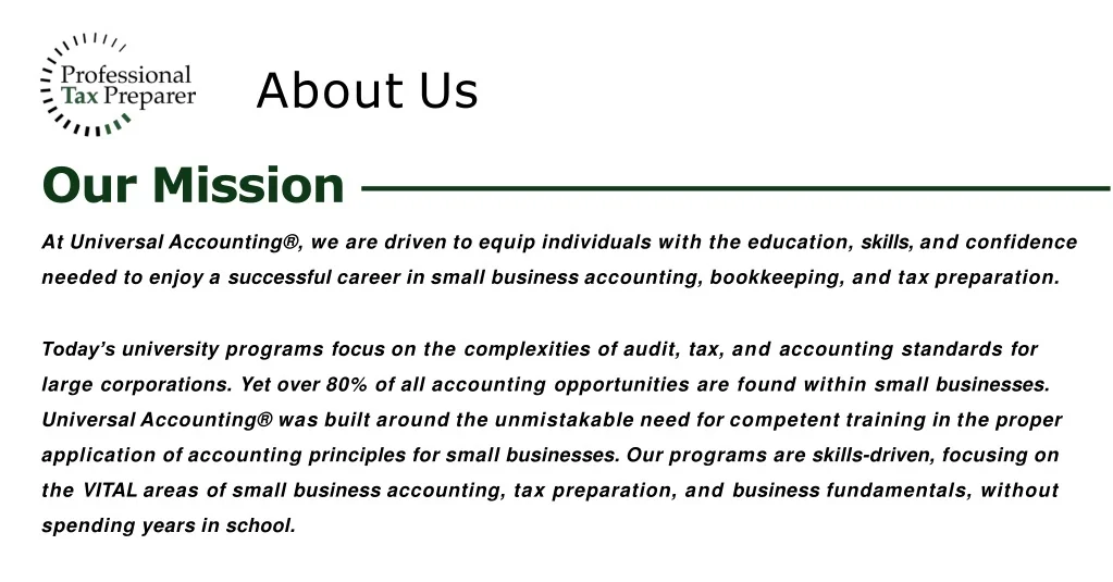 AboutUs OurMission AtUniversalAccounting®,wearedriventoequipindividualswiththeeducation,skills,andconfidence neededtoenjoyasuccessfulcareerinsmallbusinessaccounting,bookkeeping,andtaxpreparation. Today’s university programs focus on the complexities of audit, tax, and accounting standards for large corporations. Yet over 80% of all accounting opportunities are found within small businesses. UniversalAccounting®wasbuiltaroundtheunmistakableneedforcompetenttrainingintheproper applicationofaccountingprinciplesforsmallbusinesses.Ourprogramsareskills-driven,focusingon the VITAL areas of small business accounting, tax preparation, and business fundamentals, without spendingyearsinschool.
