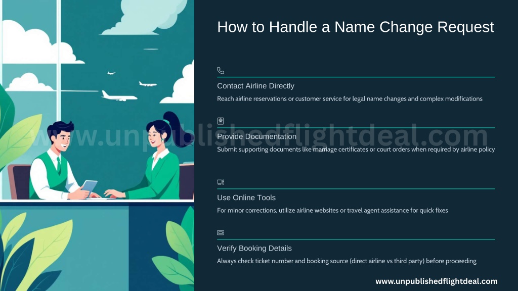 How to Handle a Name Change Request Contact Airline Directly Reach airline reservations or customer service for legal name changes and complex modifications www.unpublishedflightdeal.com Provide Documentation Submit supporting documents like marriage certificates or court orders when required by airline policy Use Online Tools For minor corrections, utilize airline websites or travel agent assistance for quick fixes Verify Booking Details Always check ticket number and booking source (direct airline vs third party) before proceeding www.unpublishedflightdeal.com