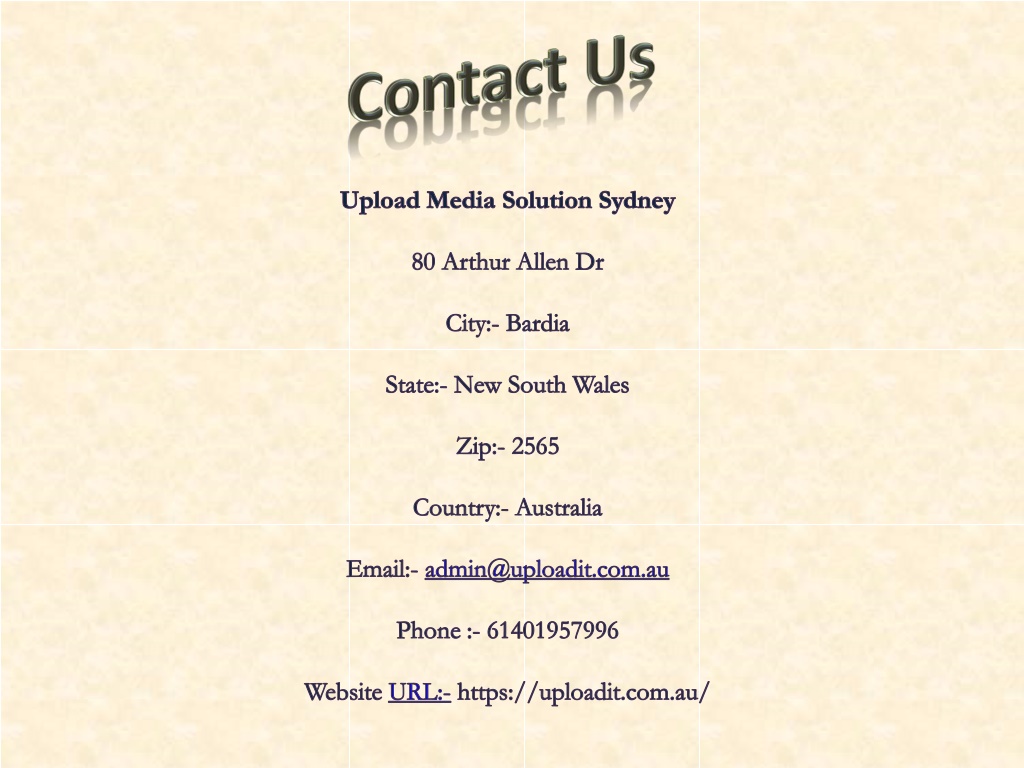 Contact Us Upload Media Solution Sydney 80 Arthur Allen Dr City:- Bardia State:- New South Wales Zip:- 2565 Country:- Australia Email:- admin@uploadit.com.au Phone :- 61401957996 Website URL:- https://uploadit.com.au/