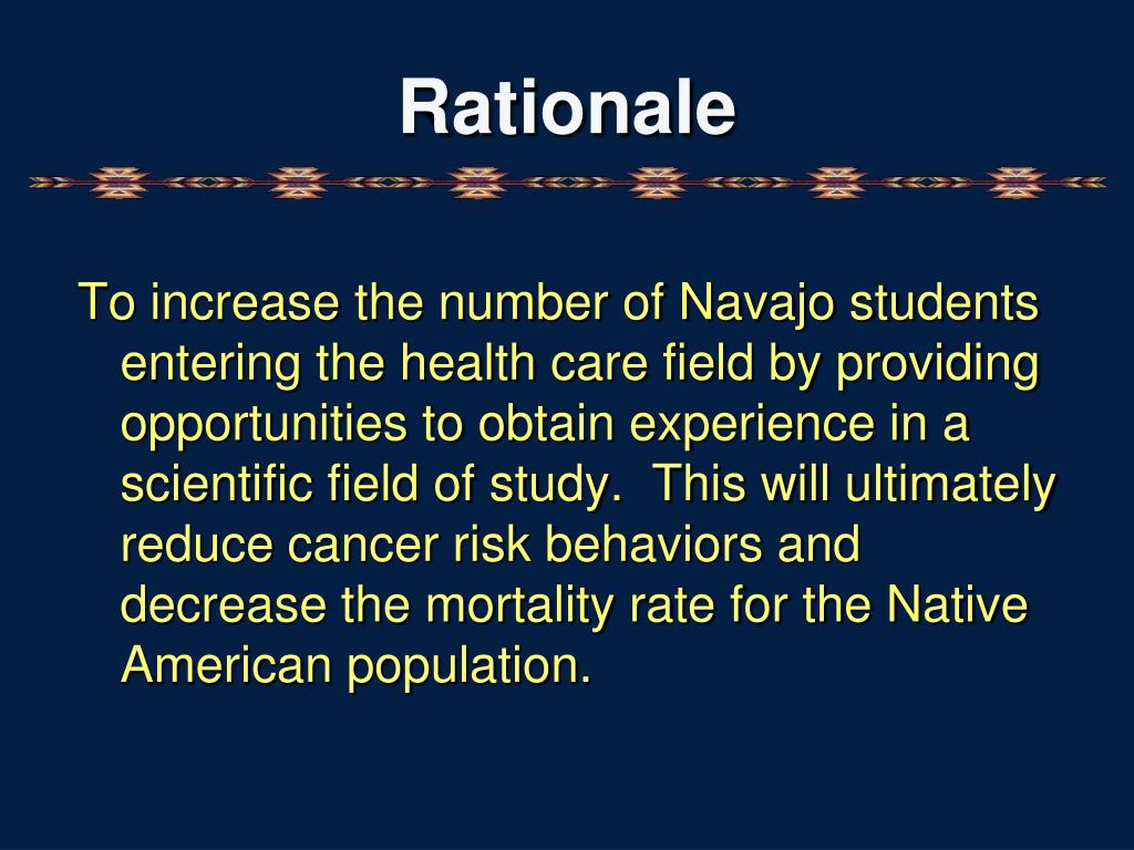 Rationale To increase the number of Navajo students entering the health care field by providing opportunities to obtain experience in a scientific field of study. This will ultimately reduce cancer risk behaviors and decrease the mortality rate for the Native American population.