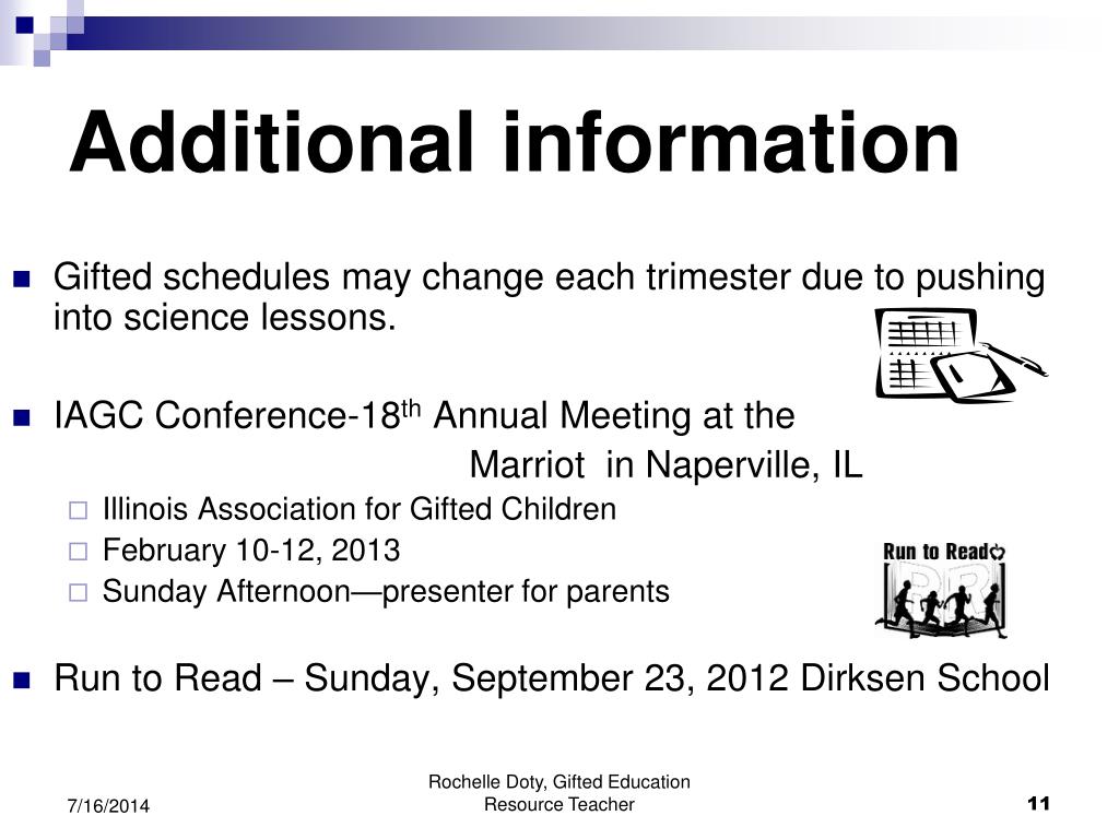 Additional information • Gifted schedules may change each trimester due to pushing into science lessons. • IAGC Conference-18th Annual Meeting at the Marriot in Naperville, IL • Illinois Association for Gifted Children • February 10-12, 2013 • Sunday Afternoon—presenter for parents • Run to Read – Sunday, September 23, 2012 Dirksen School Rochelle Doty, Gifted Education Resource Teacher