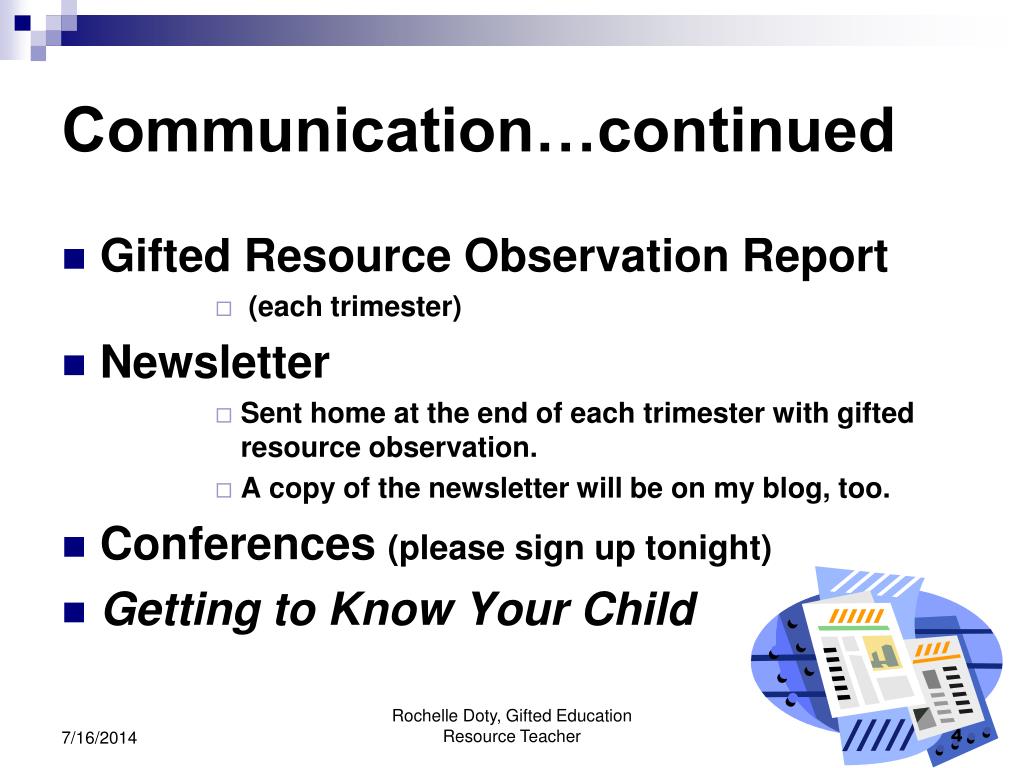 Communication…continued • Gifted Resource Observation Report • (each trimester) • Newsletter • Sent home at the end of each trimester with gifted resource observation. • A copy of the newsletter will be on my blog, too. • Conferences (please sign up tonight) • Getting to Know Your Child Rochelle Doty, Gifted Education Resource Teacher