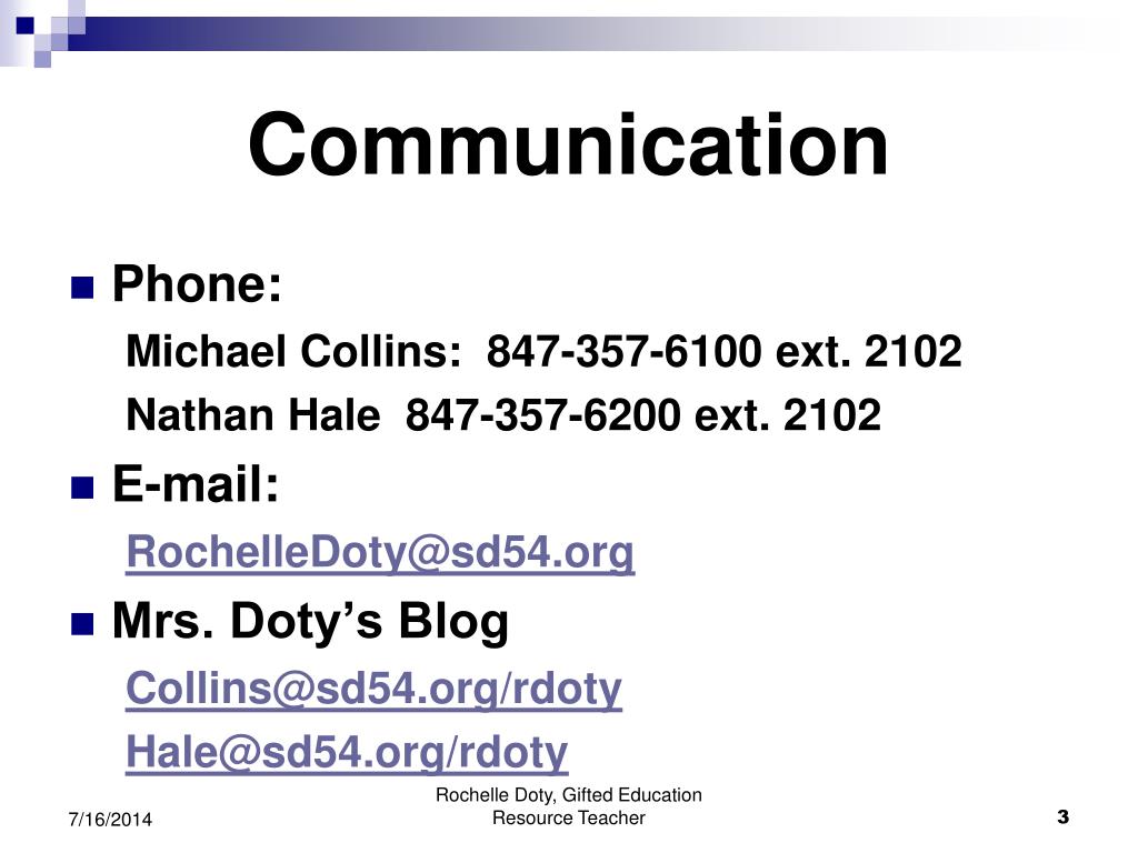 Communication • Phone: Michael Collins: 847-357-6100 ext. 2102 Nathan Hale 847-357-6200 ext. 2102 • E-mail: RochelleDoty@sd54.org • Mrs. Doty’s Blog Collins@sd54.org/rdoty Hale@sd54.org/rdoty Rochelle Doty, Gifted Education Resource Teacher