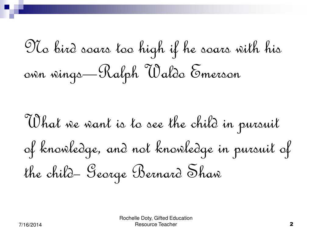 No bird soars too high if he soars with his own wings—Ralph Waldo EmersonWhat we want is to see the child in pursuit of knowledge, and not knowledge in pursuit of the child– George Bernard Shaw Rochelle Doty, Gifted Education Resource Teacher