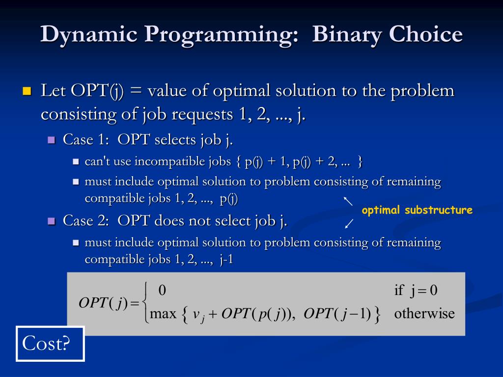 optimal substructure Dynamic Programming: Binary Choice • Let OPT(j) = value of optimal solution to the problem consisting of job requests 1, 2, ..., j. • Case 1: OPT selects job j. • can't use incompatible jobs { p(j) + 1, p(j) + 2, ... } • must include optimal solution to problem consisting of remaining compatible jobs 1, 2, ..., p(j) • Case 2: OPT does not select job j. • must include optimal solution to problem consisting of remaining compatible jobs 1, 2, ..., j-1 Cost?