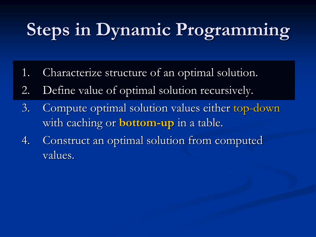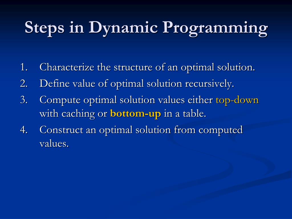 Steps in Dynamic Programming • Characterize structure of an optimal solution. • Define value of optimal solution recursively. • Compute optimal solution values either top-downwith caching or bottom-upin a table. • Construct an optimal solution from computed values.