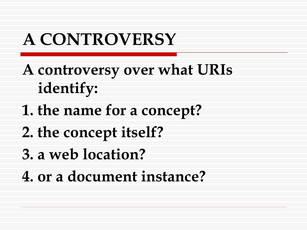 A CONTROVERSY • A controversy over what URIs identify: • 1. the name for a concept? • 2. the concept itself? • 3. a web location? • 4. or a document instance?