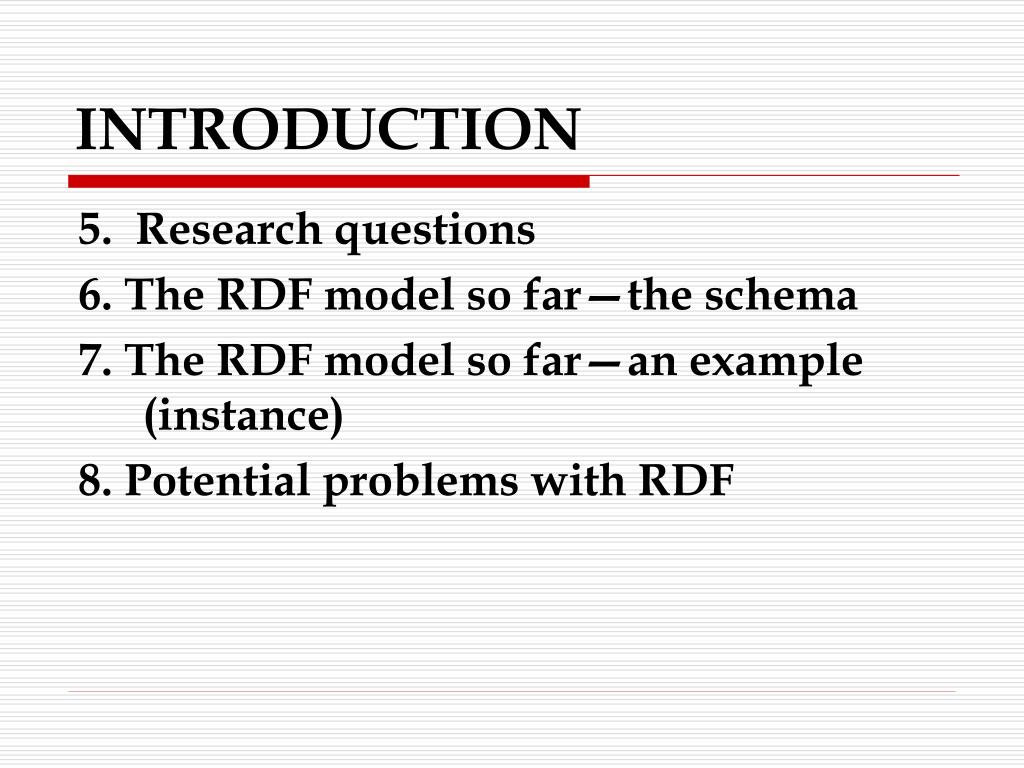 INTRODUCTION • 5. Research questions • 6. The RDF model so far—the schema • 7. The RDF model so far—an example (instance) • 8. Potential problems with RDF