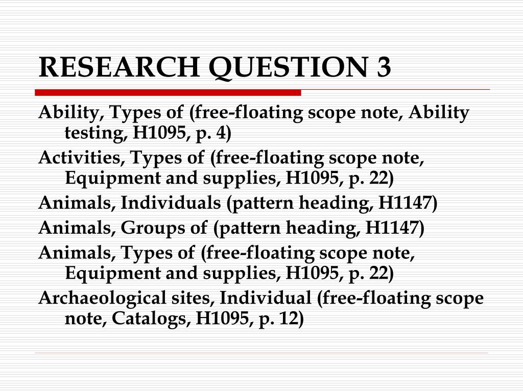 RESEARCH QUESTION 3 • Ability, Types of (free-floating scope note, Ability testing, H1095, p. 4) • Activities, Types of (free-floating scope note, Equipment and supplies, H1095, p. 22) • Animals, Individuals (pattern heading, H1147) • Animals, Groups of (pattern heading, H1147) • Animals, Types of (free-floating scope note, Equipment and supplies, H1095, p. 22) • Archaeological sites, Individual (free-floating scope note, Catalogs, H1095, p. 12)