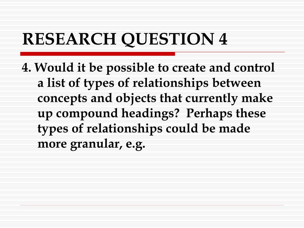 RESEARCH QUESTION 4 • 4. Would it be possible to create and control a list of types of relationships between concepts and objects that currently make up compound headings? Perhaps these types of relationships could be made more granular, e.g.
