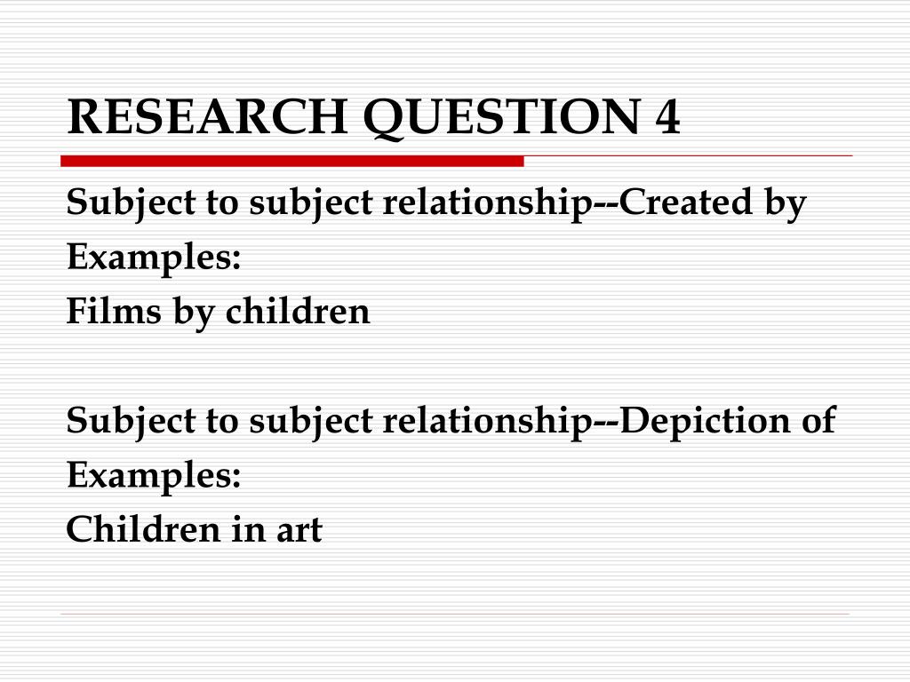 RESEARCH QUESTION 4 • Subject to subject relationship--Created by • Examples: • Films by children • Subject to subject relationship--Depiction of • Examples: • Children in art