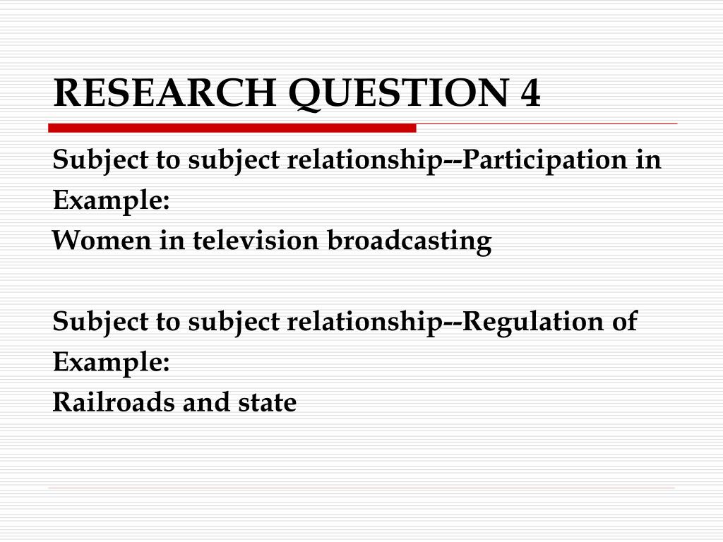 RESEARCH QUESTION 4 • Subject to subject relationship--Participation in • Example: • Women in television broadcasting • Subject to subject relationship--Regulation of • Example: • Railroads and state