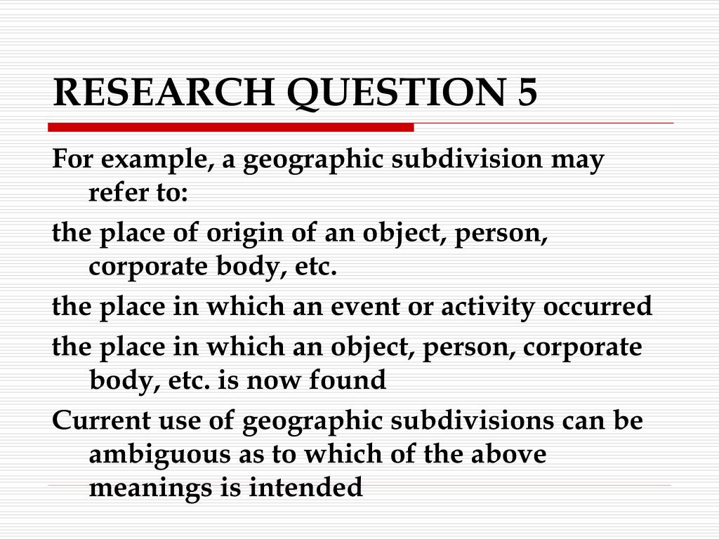 RESEARCH QUESTION 5 • For example, a geographic subdivision may refer to: • the place of origin of an object, person, corporate body, etc. • the place in which an event or activity occurred • the place in which an object, person, corporate body, etc. is now found • Current use of geographic subdivisions can be ambiguous as to which of the above meanings is intended
