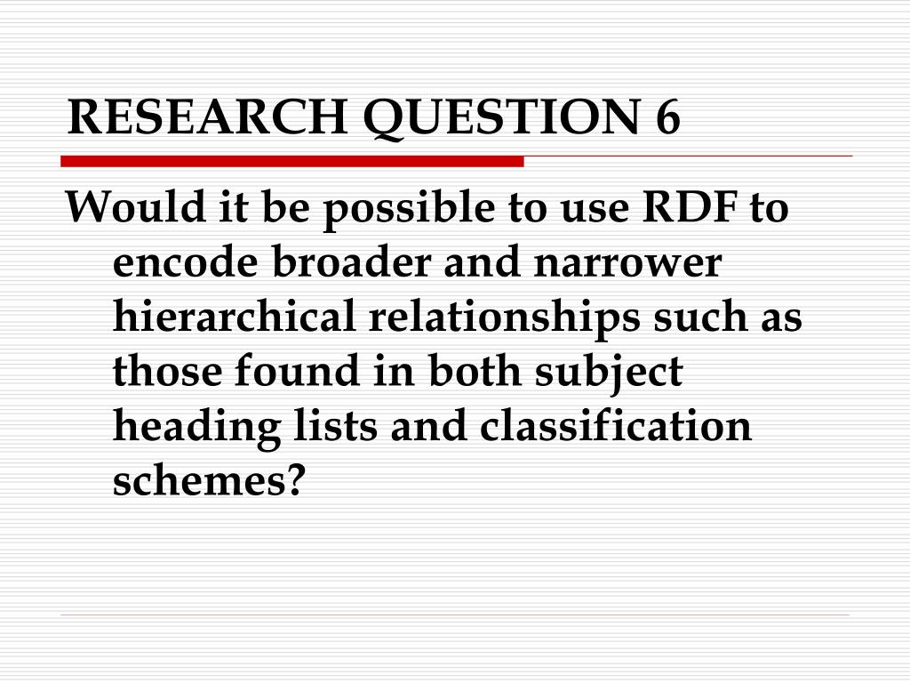RESEARCH QUESTION 6 • Would it be possible to use RDF to encode broader and narrower hierarchical relationships such as those found in both subject heading lists and classification schemes?