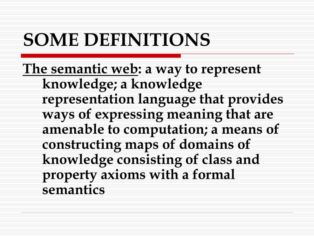 SOME DEFINITIONS • The semantic web: a way to represent knowledge; a knowledge representation language that provides ways of expressing meaning that are amenable to computation; a means of constructing maps of domains of knowledge consisting of class and property axioms with a formal semantics