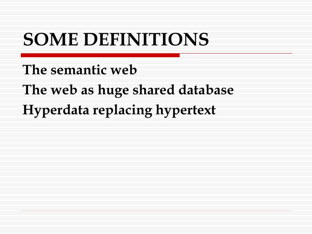 SOME DEFINITIONS • The semantic web • The web as huge shared database • Hyperdata replacing hypertext