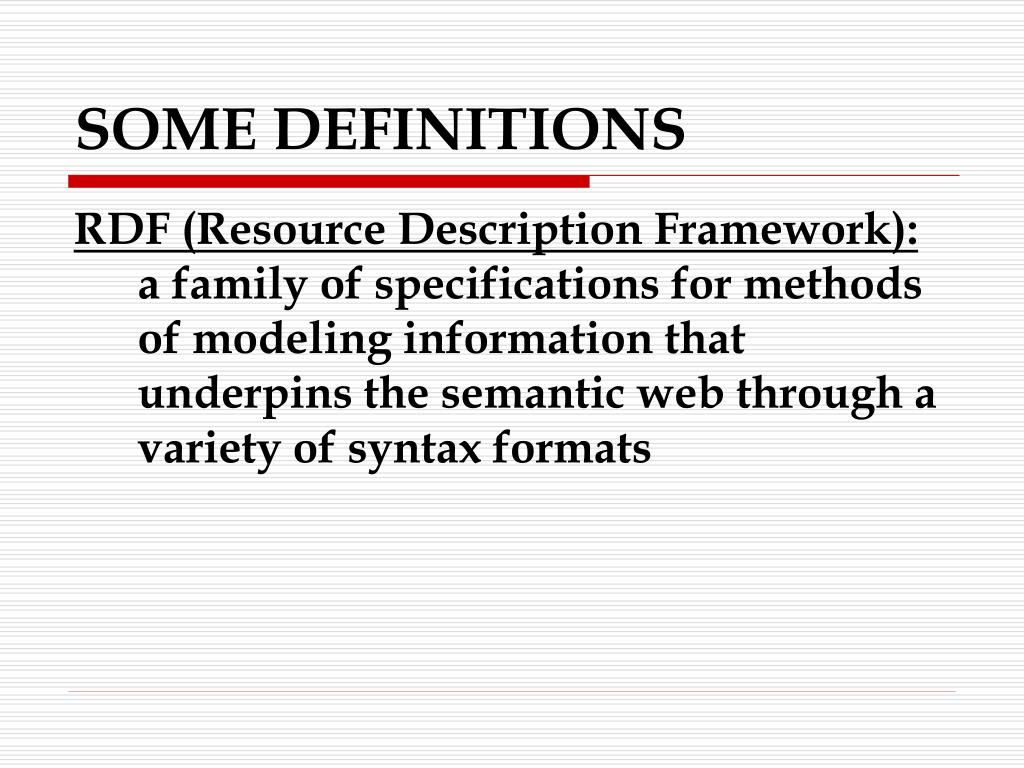 SOME DEFINITIONS • RDF (Resource Description Framework): a family of specifications for methods of modeling information that underpins the semantic web through a variety of syntax formats