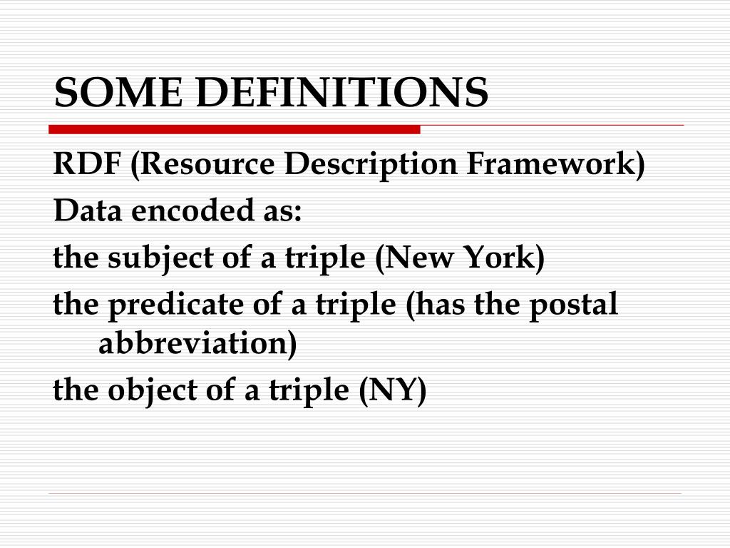 SOME DEFINITIONS • RDF (Resource Description Framework) • Data encoded as: • the subject of a triple (New York) • the predicate of a triple (has the postal abbreviation) • the object of a triple (NY)