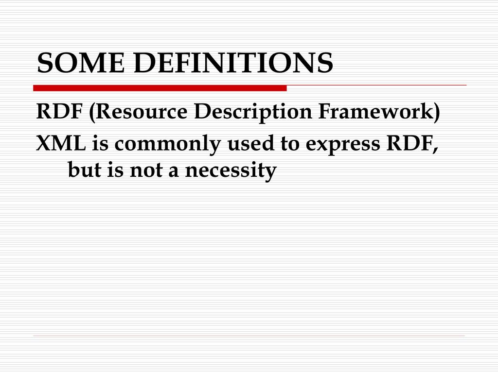 SOME DEFINITIONS • RDF (Resource Description Framework) • XML is commonly used to express RDF, but is not a necessity