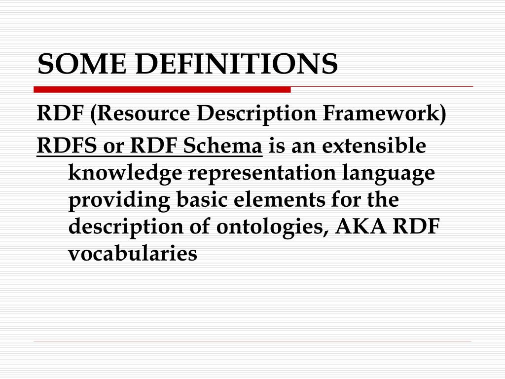 SOME DEFINITIONS • RDF (Resource Description Framework) • RDFS or RDF Schema is an extensible knowledge representation language providing basic elements for the description of ontologies, AKA RDF vocabularies