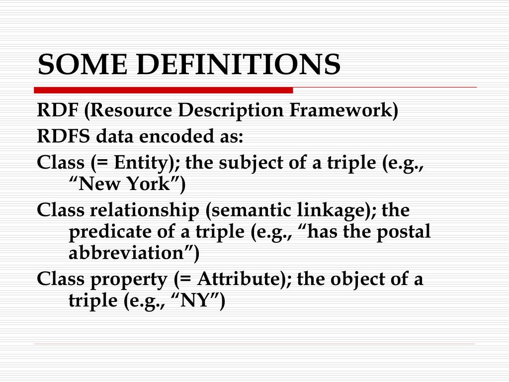 SOME DEFINITIONS • RDF (Resource Description Framework) • RDFS data encoded as: • Class (= Entity); the subject of a triple (e.g., “New York”) • Class relationship (semantic linkage); the predicate of a triple (e.g., “has the postal abbreviation”) • Class property (= Attribute); the object of a triple (e.g., “NY”)
