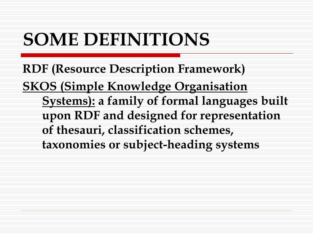 SOME DEFINITIONS • RDF (Resource Description Framework) • SKOS (Simple Knowledge Organisation Systems): a family of formal languages built upon RDF and designed for representation of thesauri, classification schemes, taxonomies or subject-heading systems