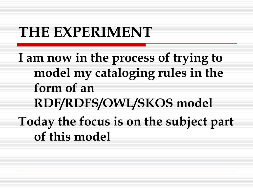 THE EXPERIMENT • I am now in the process of trying to model my cataloging rules in the form of an RDF/RDFS/OWL/SKOS model • Today the focus is on the subject part of this model
