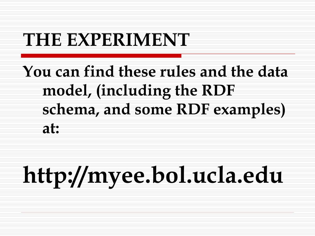 THE EXPERIMENT • You can find these rules and the data model, (including the RDF schema, and some RDF examples) at: • http://myee.bol.ucla.edu