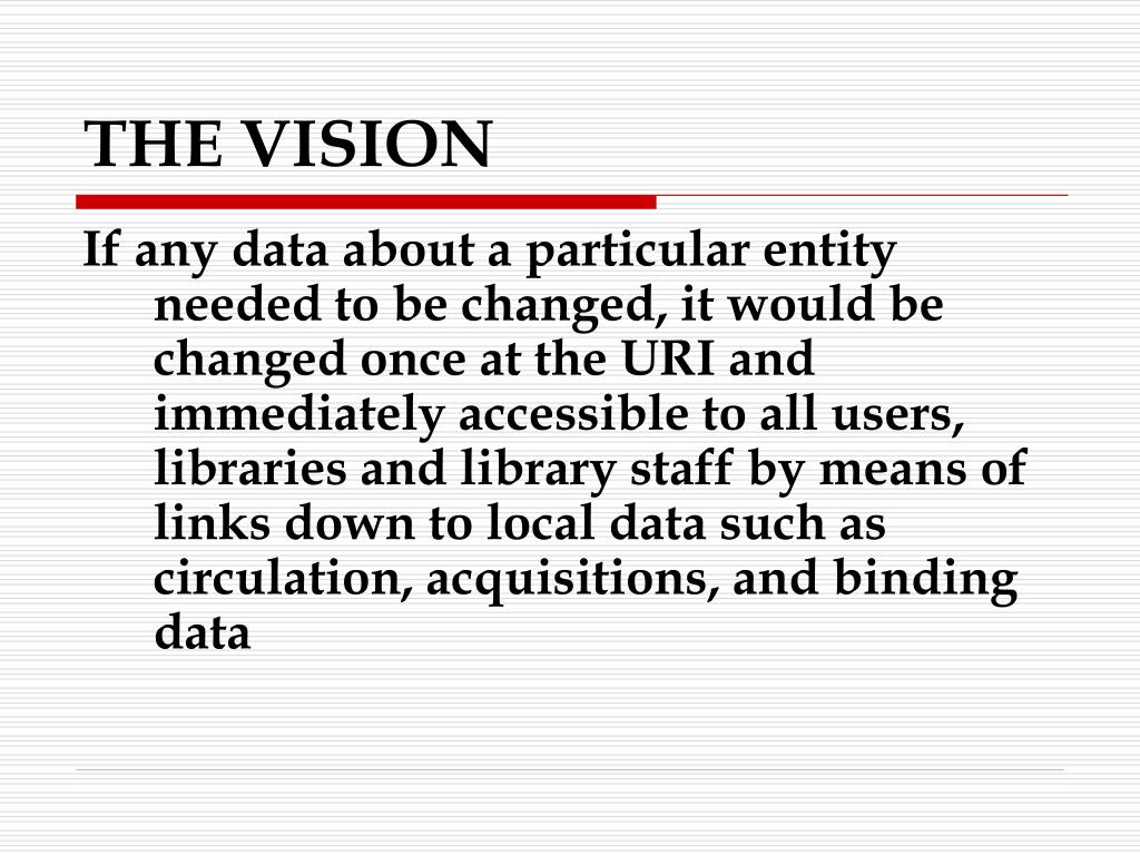 THE VISION • If any data about a particular entity needed to be changed, it would be changed once at the URI and immediately accessible to all users, libraries and library staff by means of links down to local data such as circulation, acquisitions, and binding data