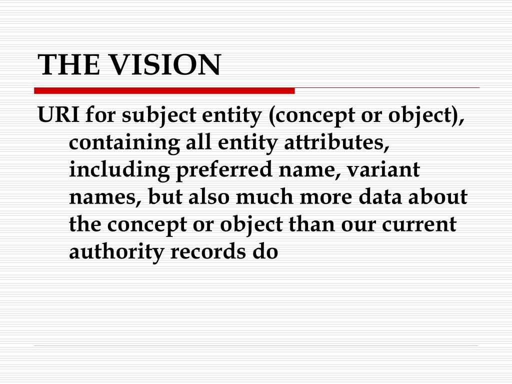 THE VISION • URI for subject entity (concept or object), containing all entity attributes, including preferred name, variant names, but also much more data about the concept or object than our current authority records do