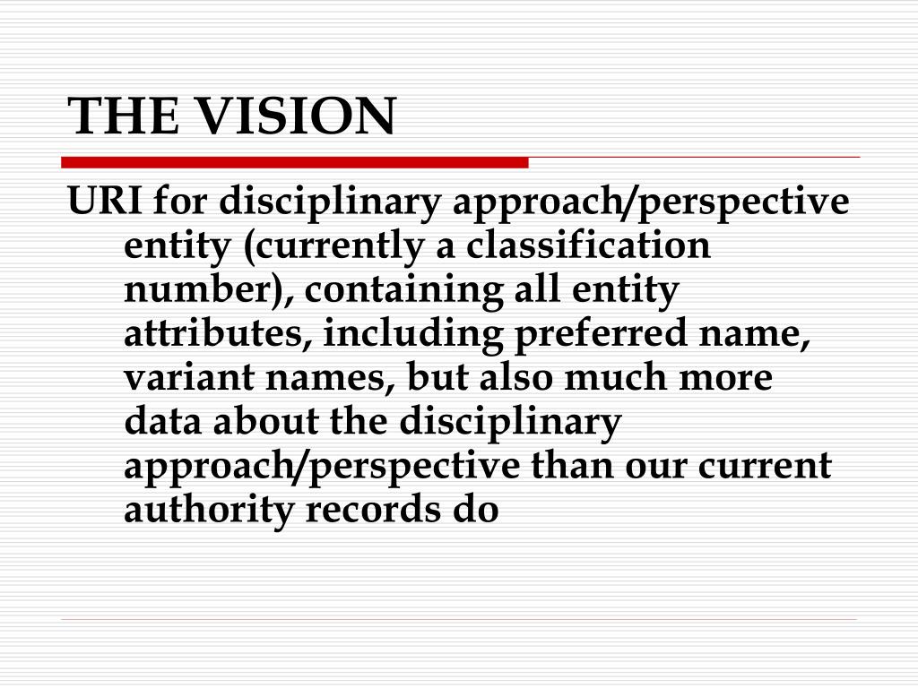 THE VISION • URI for disciplinary approach/perspective entity (currently a classification number), containing all entity attributes, including preferred name, variant names, but also much more data about the disciplinary approach/perspective than our current authority records do