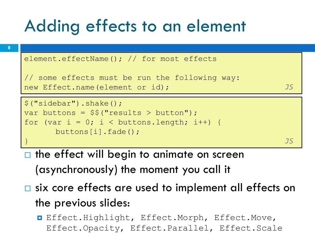 Adding effects to an element element.effectName(); // for most effects // some effects must be run the following way: new Effect.name(element or id);JS • the effect will begin to animate on screen (asynchronously) the moment you call it • six core effects are used to implement all effects on the previous slides: • Effect.Highlight, Effect.Morph, Effect.Move, Effect.Opacity, Effect.Parallel, Effect.Scale $("sidebar").shake(); var buttons = $$("results > button"); for (var i = 0; i < buttons.length; i++) { buttons[i].fade(); }JS