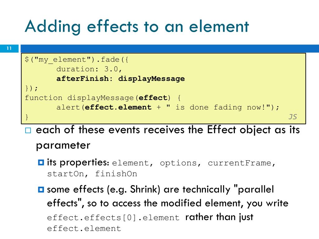 Adding effects to an element $("my_element").fade({ duration: 3.0, afterFinish: displayMessage }); function displayMessage(effect) { alert(effect.element + " is done fading now!"); }JS • each of these events receives the Effect object as its parameter • its properties: element, options, currentFrame, startOn, finishOn • some effects (e.g. Shrink) are technically "parallel effects", so to access the modified element, you write effect.effects[0].element rather than just effect.element