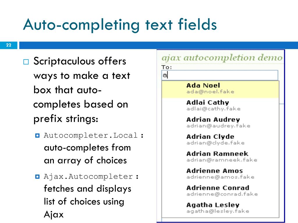 Using Autocompleter.Local <input id="bands70s" size="40" type="text" /> <div id="bandlistarea"></div>HTML document.observe("dom:loaded", function() { new Autocompleter.Local( "bands70s", "bandlistarea", ["ABBA", "AC/DC", "Aerosmith", "America", "Bay City Rollers", ...], {} ); });JS CS380