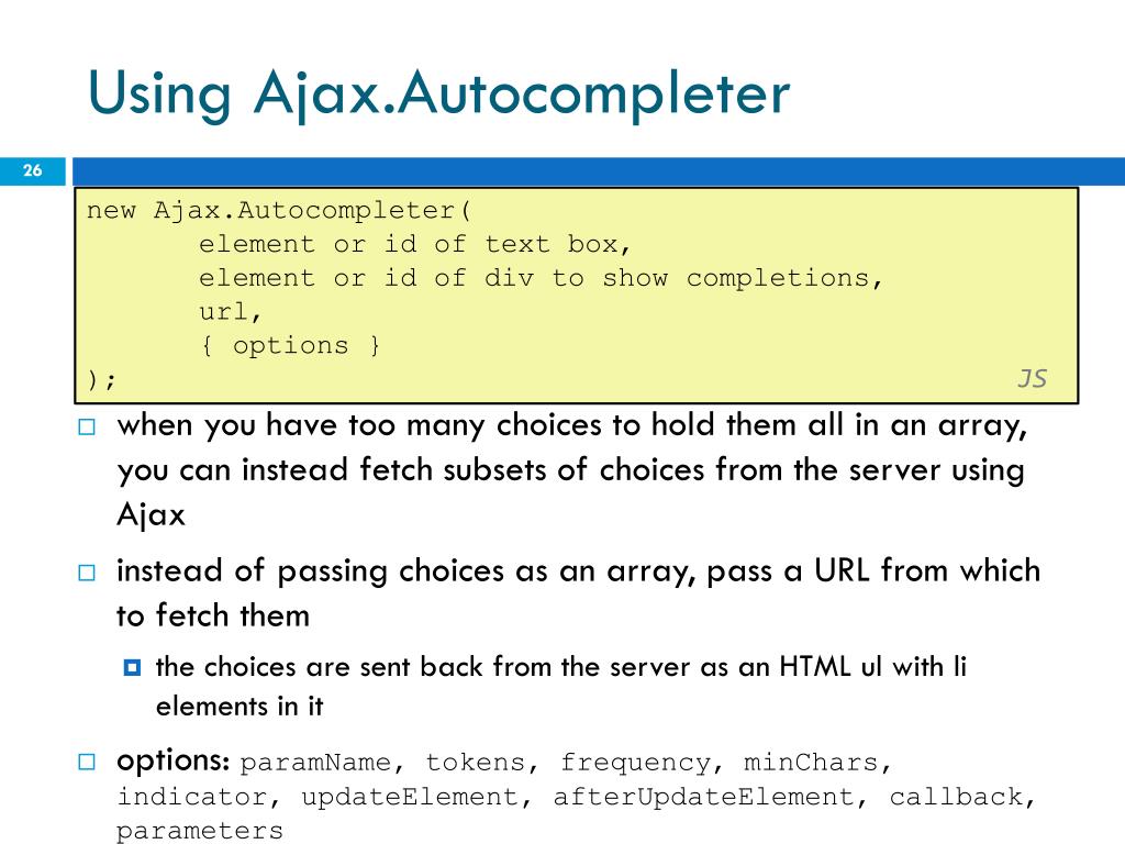 Using Ajax.Autocompleter new Ajax.Autocompleter( element or id of text box, element or id of div to show completions, url, { options } );JS • when you have too many choices to hold them all in an array, you can instead fetch subsets of choices from the server using Ajax • instead of passing choices as an array, pass a URL from which to fetch them • the choices are sent back from the server as an HTML ul with li elements in it • options: paramName, tokens, frequency, minChars, indicator, updateElement, afterUpdateElement, callback, parameters