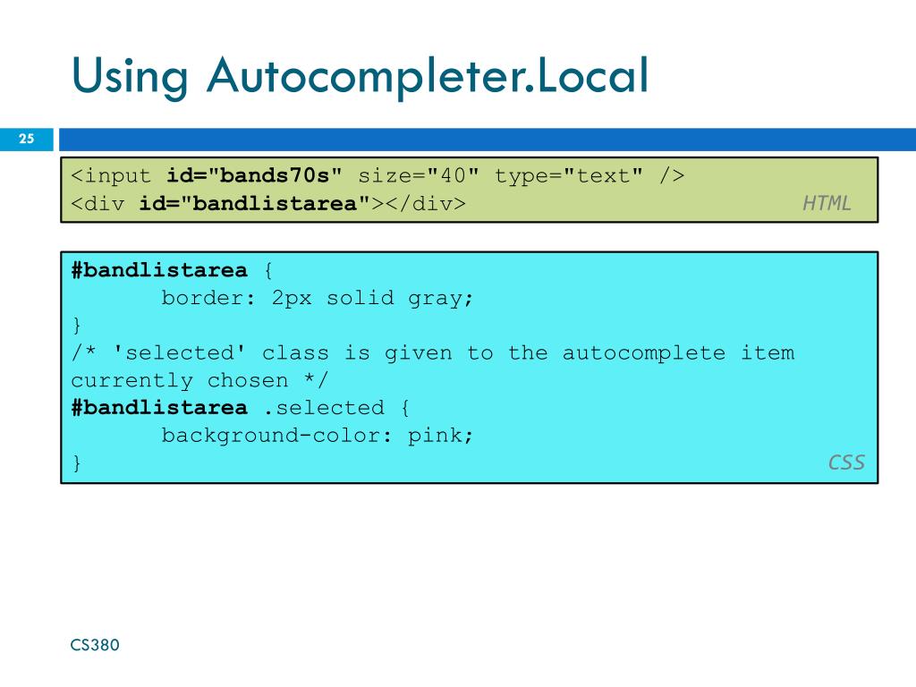 Using Autocompleter.Local <input id="bands70s" size="40" type="text" /> <div id="bandlistarea"></div>HTML #bandlistarea{ border: 2px solid gray; } /* 'selected' class is given to the autocomplete item currently chosen */ #bandlistarea.selected { background-color: pink; }CSS CS380