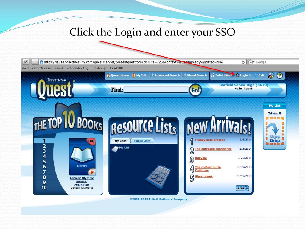 Destiny Quest. Use Destiny Quest to: Find the top ten books checked out Locate new Arrivals Build reading lists that you can share with others Keep track of what you’ve read and what you’d like to read Search for books. Go to www.garfieldhs.org Click on the LIBRARY link.