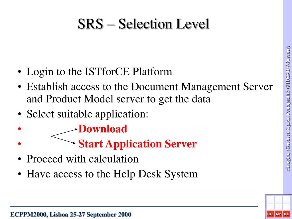 Login to the ISTforCE Platform Establish access to the Document Management Server and Product Model server to get the data Select suitable application: Download Start Application Server Proceed with calculation Have access to the Help Desk System SRS – Selection Level