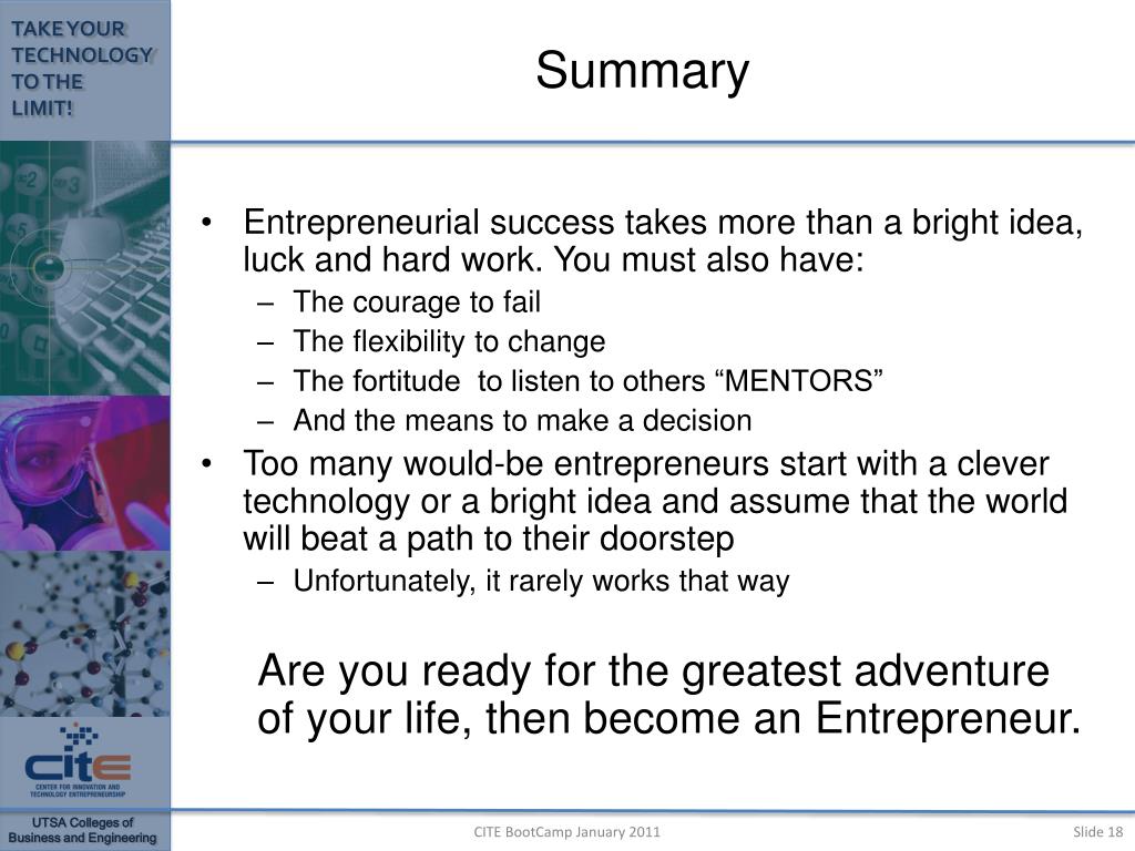 Summary • Entrepreneurial success takes more than a bright idea, luck and hard work. You must also have: • The courage to fail • The flexibility to change • The fortitude to listen to others “MENTORS” • And the means to make a decision • Too many would-be entrepreneurs start with a clever technology or a bright idea and assume that the world will beat a path to their doorstep • Unfortunately, it rarely works that way Are you ready for the greatest adventure of your life, then become an Entrepreneur. CITE BootCamp January 2011