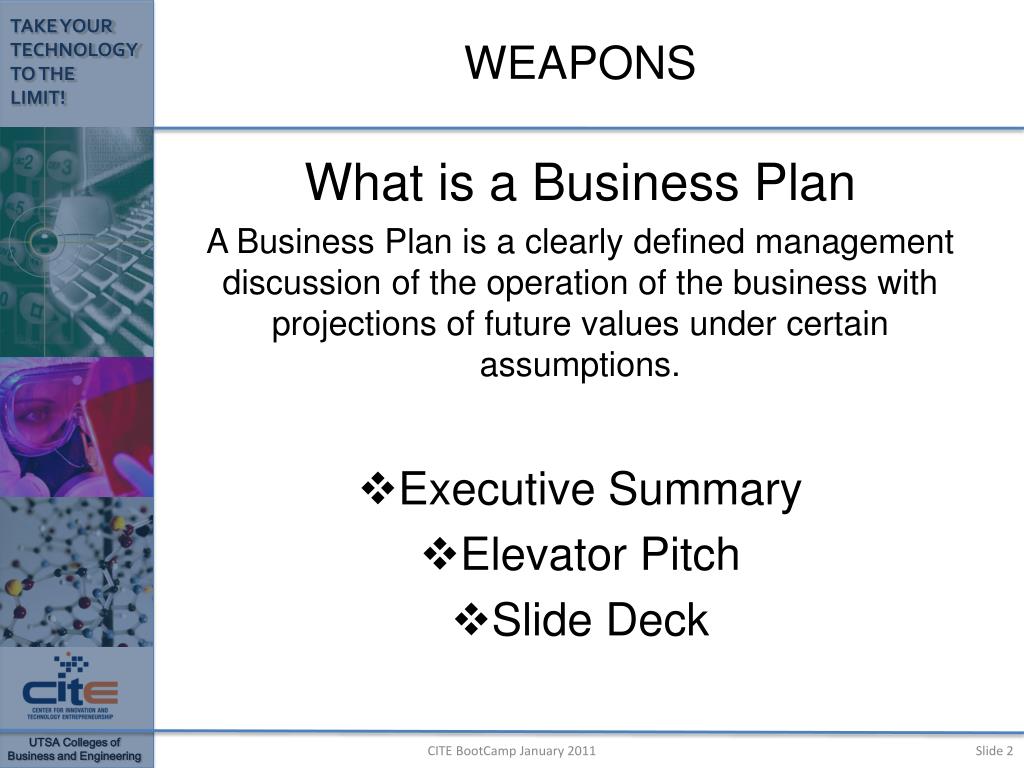 WEAPONS What is a Business Plan A Business Plan is a clearly defined management discussion of the operation of the business with projections of future values under certain assumptions. • Executive Summary • Elevator Pitch • Slide Deck CITE BootCamp January 2011