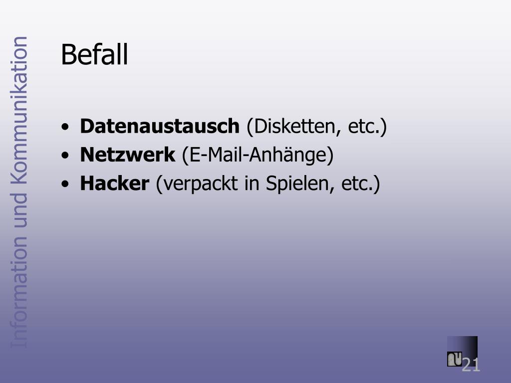 Befall • Datenaustausch (Disketten, etc.) • Netzwerk (E-Mail-Anhänge) • Hacker (verpackt in Spielen, etc.)
