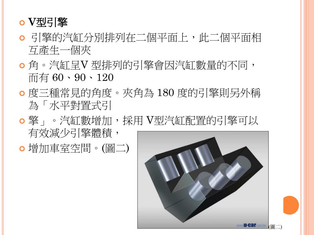 V型引擎 • 引擎的汽缸分別排列在二個平面上,此二個平面相互產生一個夾 • 角。汽缸呈V 型排列的引擎會因汽缸數量的不同,而有 60、90、120 • 度三種常見的角度。夾角為 180 度的引擎則另外稱為「水平對置式引 • 擎」。汽缸數增加,採用 V型汽缸配置的引擎可以有效減少引擎體積, • 增加車室空間。(圖二)