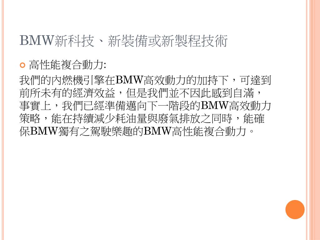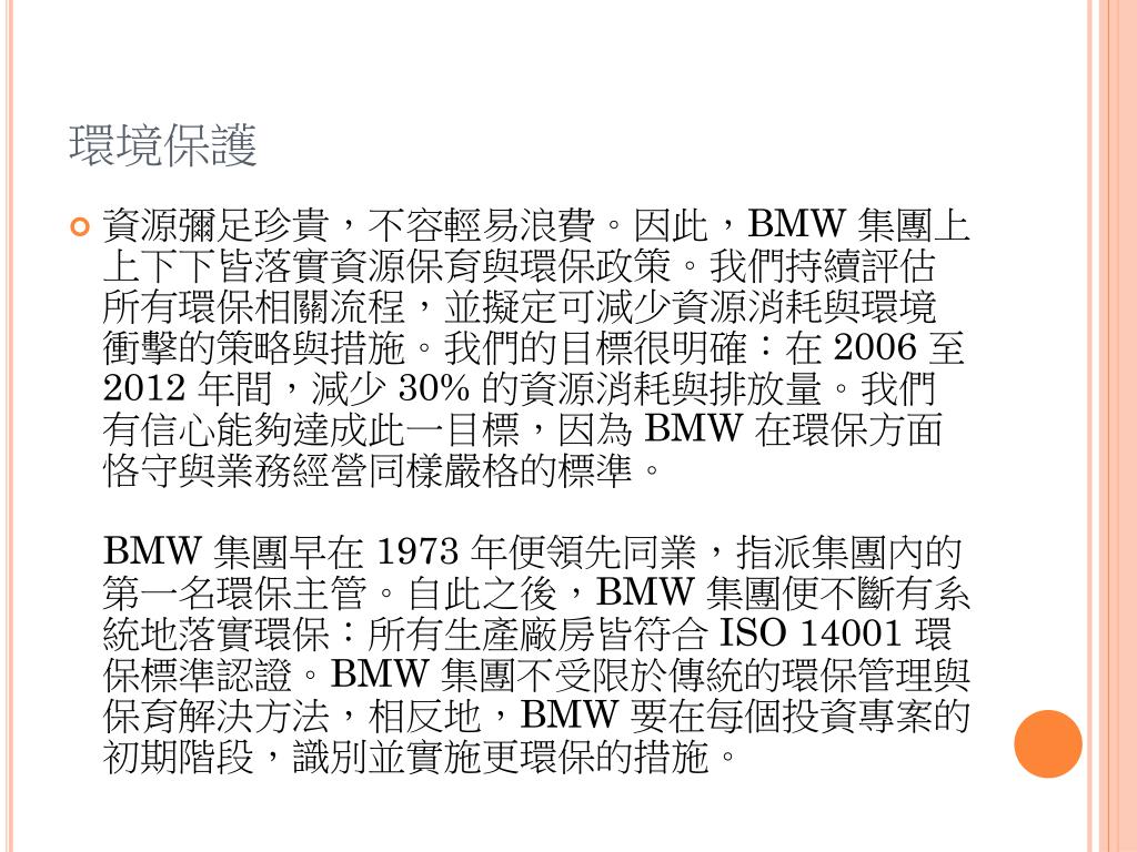 結論 • BMW可說是世界上最受尊崇的汽車製造者,以豪華與高性能表現聞名並激發出顧客一種幾乎狂熱的忠誠。它不但結合了世界級的工程技術、聰明的管理團隊以及獨特的公司文化,也持續生產在業界被當做最多評量基準的卓越汽車。