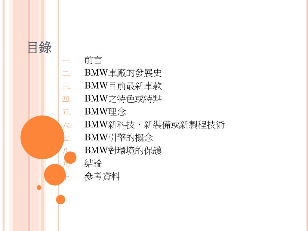 目錄 前言 BMW車廠的發展史 BMW目前最新車款 BMW之特色或特點 BMW理念 BMW新科技、新裝備或新製程技術 BMW引擎的概念 BMW對環境的保護 結論 參考資料