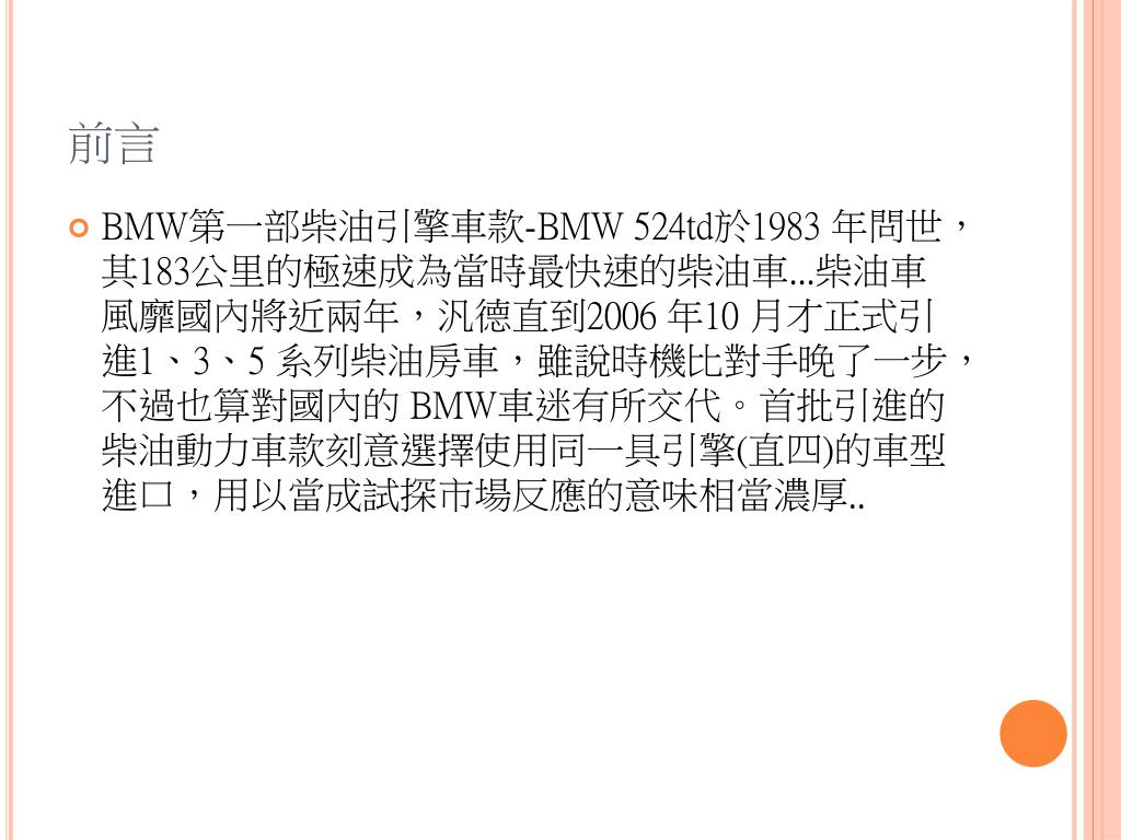 前言 • BMW第一部柴油引擎車款-BMW 524td於1983 年問世,其183公里的極速成為當時最快速的柴油車...柴油車風靡國內將近兩年,汎德直到2006 年10 月才正式引進1、3、5 系列柴油房車,雖說時機比對手晚了一步,不過也算對國內的 BMW車迷有所交代。首批引進的柴油動力車款刻意選擇使用同一具引擎(直四)的車型進口,用以當成試探市場反應的意味相當濃厚..