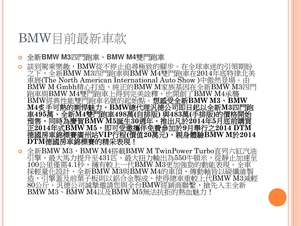 BMW目前最新車款 • 全新BMW M3四門跑車、BMW M4雙門跑車 • 談到駕乘樂趣,BMW從不停止追尋極致的腳步。在全球車迷的引領期盼之下,全新BMW M3四門跑車與BMW M4雙門跑車在2014年底特律北美車展(The North American International Auto Show )中傲然登場。由BMW M Gmbh精心打造,純正的BMW M家族基因在全新BMW M3四門跑車與BMW M4雙門跑車上得到完美詮釋,也開創了BMW M4承襲BMW經典性能雙門跑車名號的起始點。想感受全新BMW M3、BMW M4炙手可熱的剽悍魅力,BMW總代理汎德公司即日起以全新M3四門跑車495萬、全新M4雙門跑車498萬(自排版) 與483萬(手排版)的價格開始預售,同時為慶賀BMW M5誕生30週年,推出凡於2014年5月底前購買正2014年式BMW M5,即可受邀攜伴免費參加於9月舉行之2014 DTM德國房車錦標賽廣州站VIP行程(價值20萬元),親身體驗BMW M於2014 DTM德國房車錦標賽的精采表現! • 全新BMW M3、BMW M4搭載BMW M TwinPower Turbo直列六缸汽油引擎,最大馬力提升至431匹、最大扭力輸出為550牛頓米,從靜止加速至100公里僅需4.1秒,擁有較上一代BMW M3更加強勁的動能表現。全車採輕量化設計,全新BMW M3與BMW M4的車頂、傳動軸皆以碳纖維製造,引擎蓋及前葉子板則以鋁合金製成,使得總車重較上代BMW M3減輕80公斤。汎德公司誠摯邀請您與全台BMW經銷商聯繫,搶先入主全新BMW M3、BMW M4以及BMW M5無法抗拒的熱血魅力!