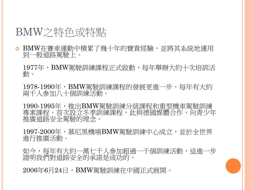 BMW之特色或特點 • BMW在賽車運動中積累了幾十年的寶貴經驗,並將其系統地運用到一般道路駕駛上。1977年,BMW駕駛訓練課程正式啟動,每年舉辦大約十次培訓活動。1978-1990年,BMW駕駛訓練課程的發展更進一步,每年有大約兩千人參加八十個訓練活動。1990-1995年,推出BMW駕駛訓練分級課程和重型機車駕駛訓練專案課程。首次設立冬季訓練課程,此與德國媒體合作,向青少年推廣道路安全駕駛的理念。1997-2000年,慕尼黑機場BMW駕駛訓練中心成立,並於全世界進行推廣活動。如今,每年有大約一萬七千人參加超過一千個訓練活動,這進一步證明我們對道路安全的承諾是成功的。2006年6月24日,BMW駕駛訓練在中國正式展開。